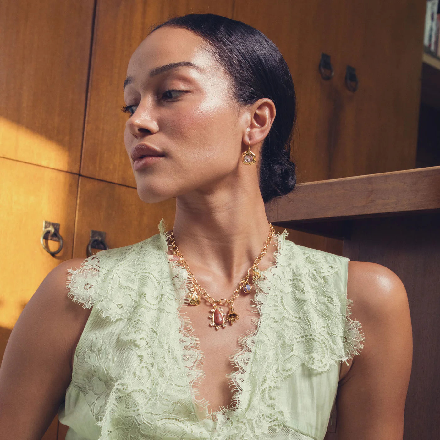 This charm necklace brings together sculptural details and semi-precious stones for a look that's both whimsical and refined. Suspended from a gold-plated chain, the piece features a mix of hand-carved floral charms, luminous pearls, and colorful stones. A playful yet timeless statement that layers beautifully or shines on its own.