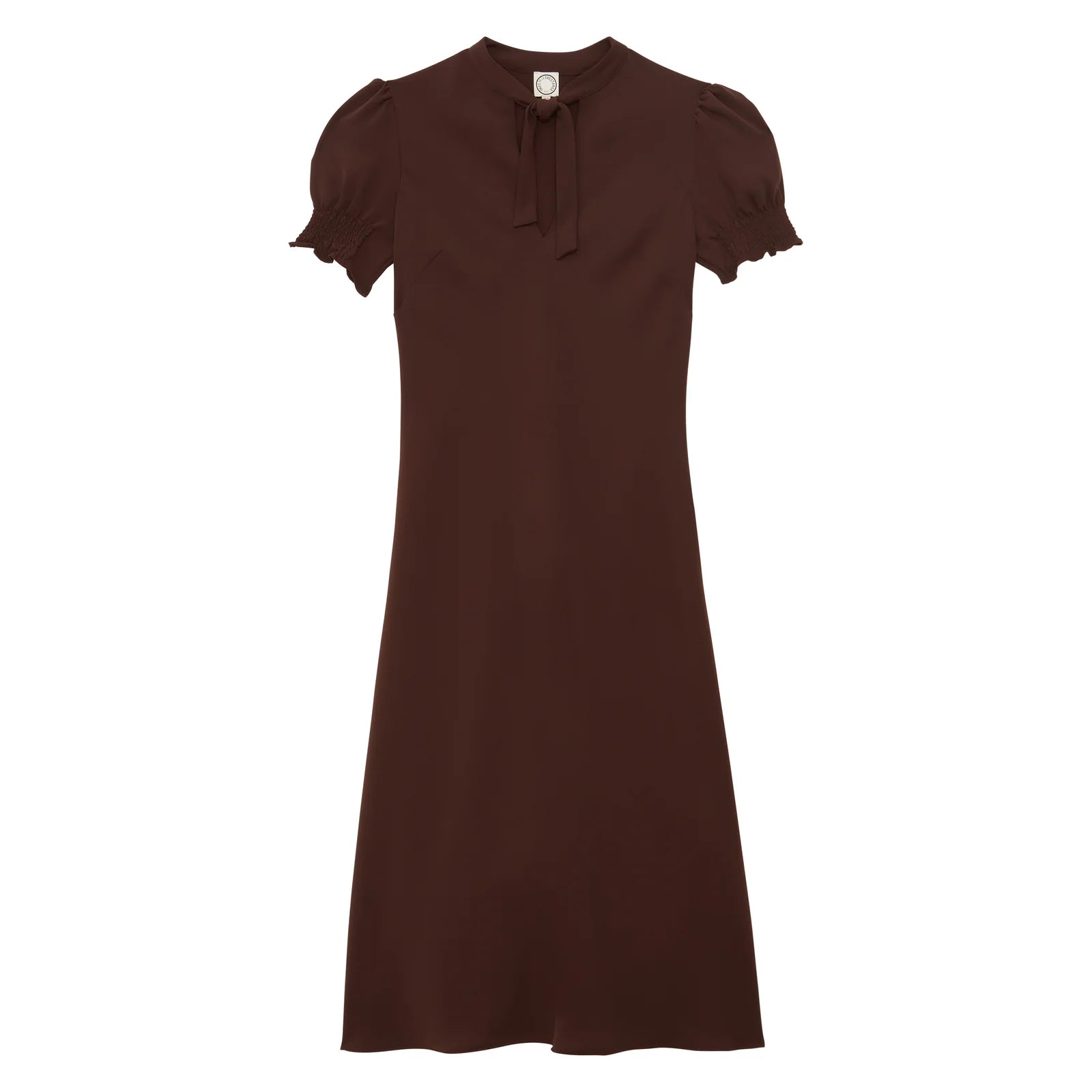 The Cerise dress is the embodiment of subtle retro elegance. Its fluid lines, fitted just right, hug the figure naturally. The teardrop-shaped collar with bow adds a touch of charm, while the 3/4-length sleeves lighten the ensemble with finesse. A piece full of character, ideal for those who like to combine femininity and sobriety without ever giving up a certain allure.