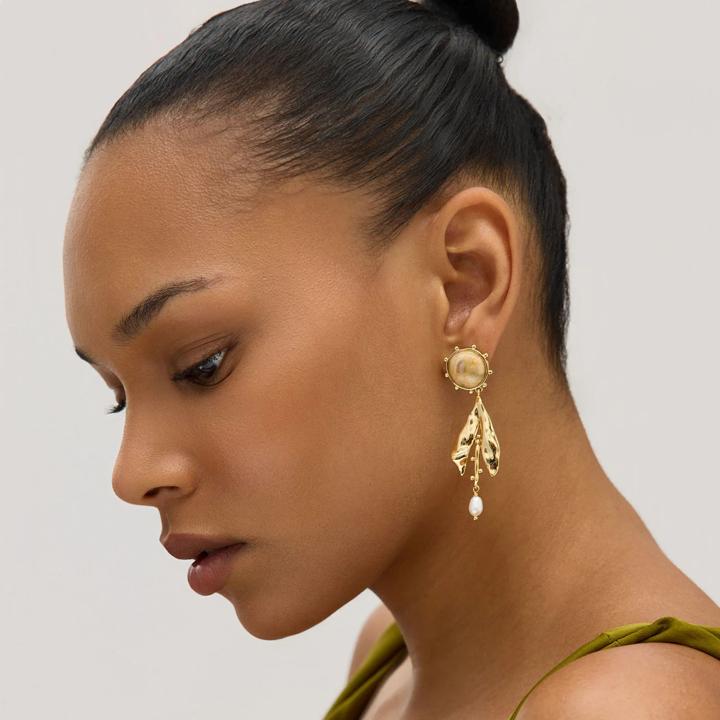 Elevate your collection with the Della Earrings, featuring lustrous freshwater pearls paired elegantly with semi-precious stones. Set in refined gold, these delicate drop earrings bring a subtle yet sophisticated touch to any ensemble, perfect for those who appreciate timeless craftsmanship and expert design.
