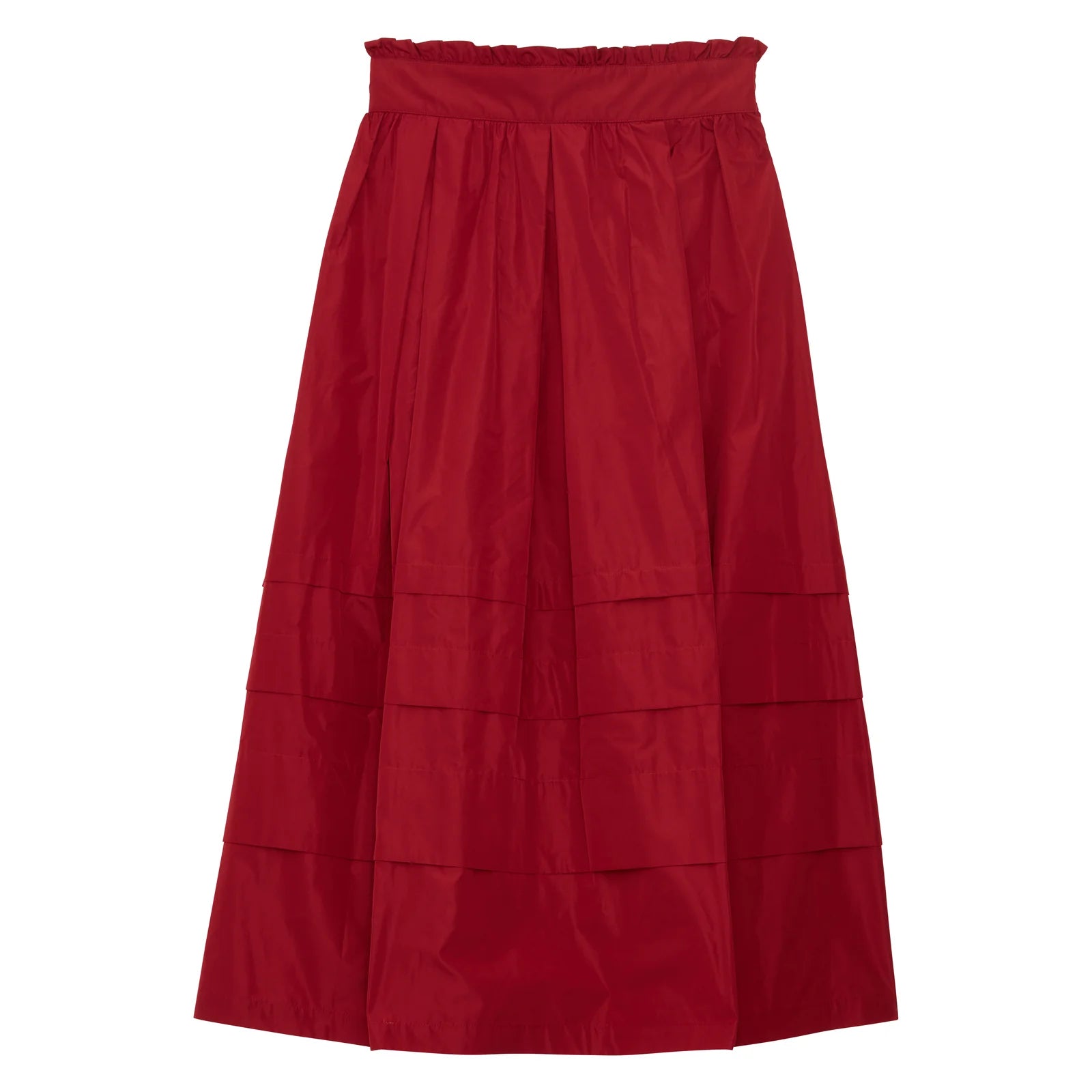 A perfect blend of simplicity and refinement, the Héloïse skirt in red taffeta has an elegant allure. Its flared cut, punctuated with ruffles, adds lovely volume as it moves, while the elasticated waist and subtle pleats emphasise an effortlessly fluid silhouette. A versatile piece that crosses the seasons with elegance.