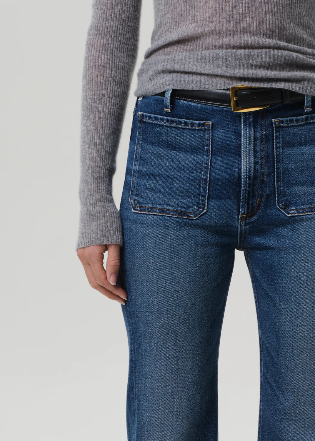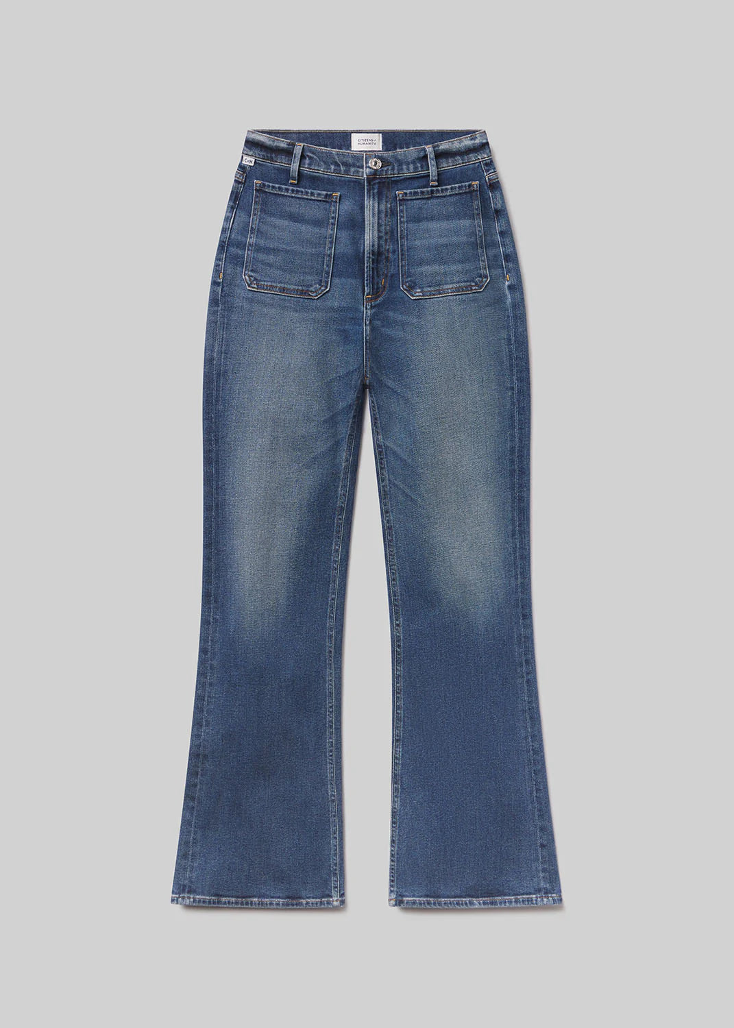 The Kimberly is a high-rise flare designed to elongate the leg and contour the waist. This version is finished with front patch pockets for a subtle utilitarian twist. Crafted from comfort stretch archive denim with a super soft hand, the Abalone wash—a medium indigo with fading and marbling—adds a vintage-inspired finish. Style with crisp shirting or fitted knits for an effortlessly polished look.